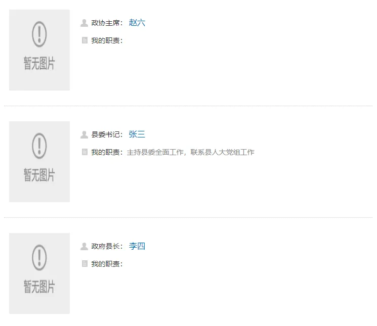 ldzc的节点中筛选3条图文内容,关键配置包括:显示封面图片(尺寸固定为150×200像素)、正文摘要截断至320字符(自动去除HTML标签)、启用扩展字段数据加载(ExtendField=true)、通过leaderList样式类实现领导信息特有的图文混排效果,适用于领导班子介绍、领导动态等需要突出人物形象与详细简介的官方页面场景。效果图: