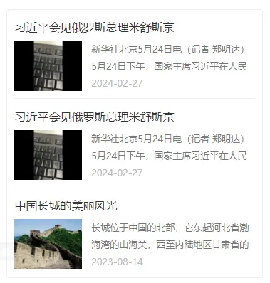 spxw的节点中筛选3条视频内容,配置参数包括:标题截断至100字符、日期格式化为yyyy-MM-dd、封面图固定尺寸为200x150像素。适用于需要展示视频封面、标题及发布时间的场景,如视频新闻列表页。效果图: